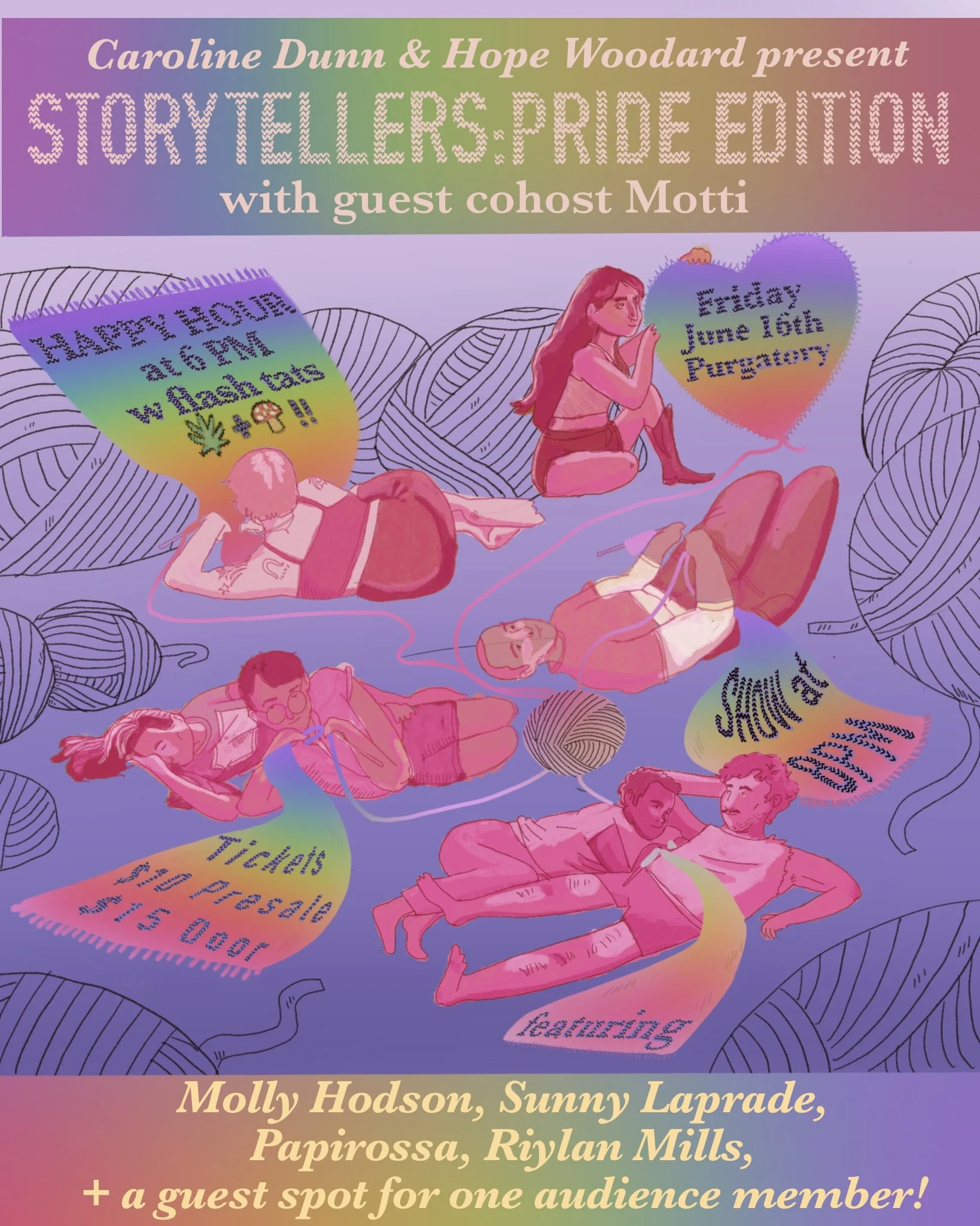 poster for "storytellers: pride edition" at purgatory. june 2023.